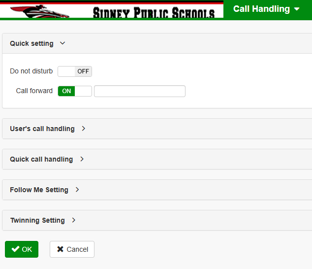 To setup/change your call forwarding settings and email, log into the user portal using your 3 digit extension and PIN (see Phone User Portal guide). https://10.0.3.7/voice/
